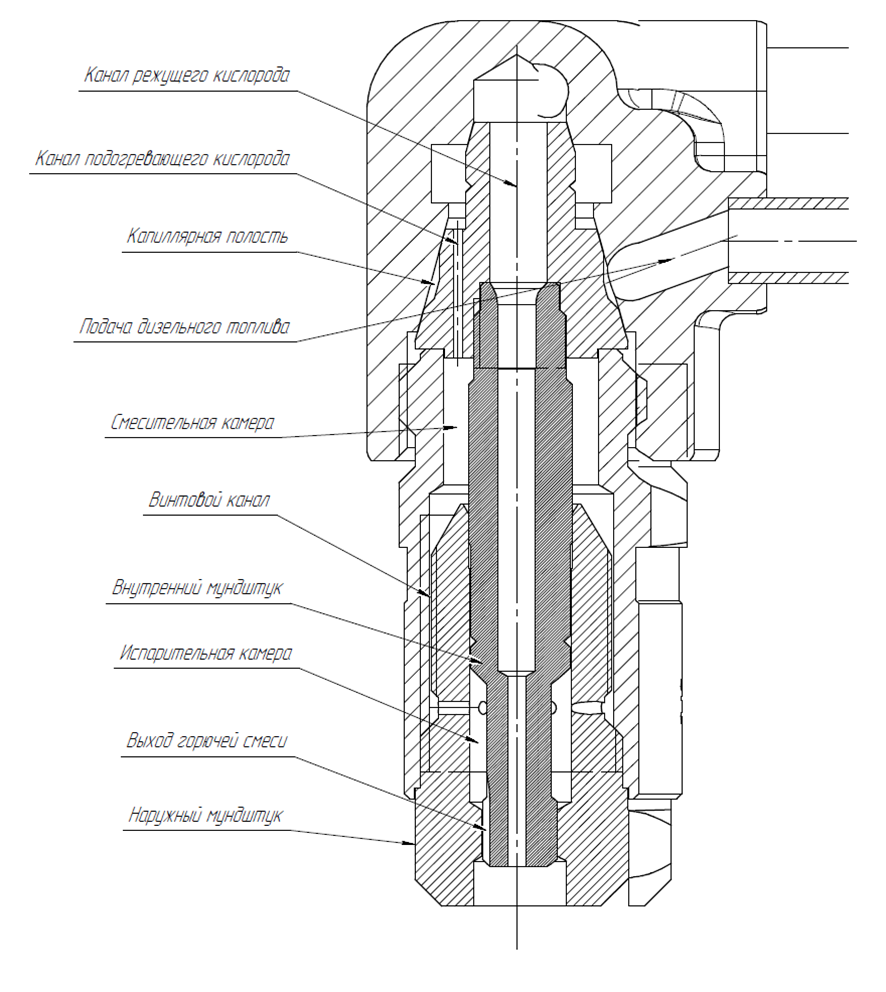 Предпочтительный вариант дизельного резака МДУ, содержит сборную головку, снабженную наружным мундштуком и внутренним мундштуком. В корпусе сборной головки, в смесителе и внутреннем мундштуке выполнен канал режущего кислорода. При этом наружный и внутренний мундштуки образуют выход для горючей смеси из дизельного резака МДУ, соединенный со смесительным каналом.